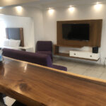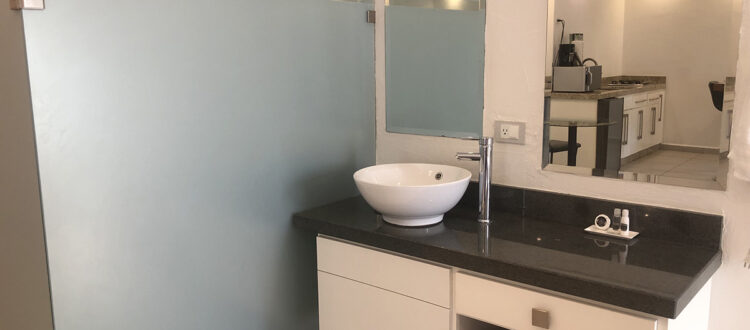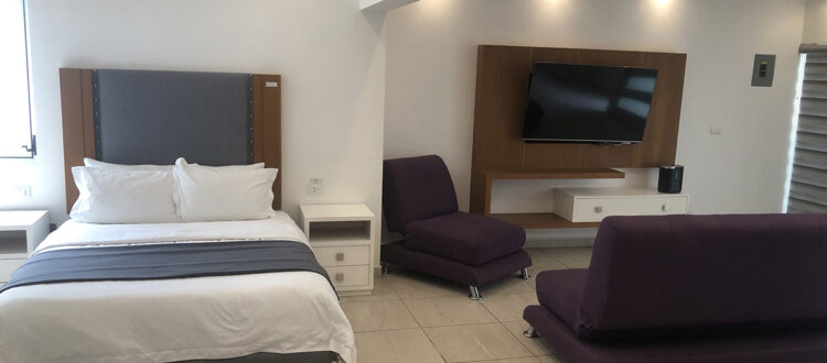 La Suite Master es muy amplia y cuenta con dos cama queen separadas o juntas , un baño completo, su lavamos, con espacio de mostrador y silloncito, closet mediano, una plancha, su tele smart, tiene dos mesitas de noche a los lados de cada cama, un sillón, tiene su cocina que cuenta con los utensilios de cocina (platos, tenedores, cucharas, sartenes, vasos, tazas, cuchillos, cucharas grandes), microondas y cafetera, tiene un área de sala, con dos sillones, una barra con 4 sillas y una secadora, aire acondicionado.
