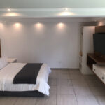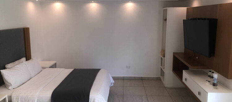 La suite sencilla es amplia y cuenta con una cama queen, un baño completo, su lavamos, con espacio de mostrador y silloncito, closet mediano, una plancha, su tele smart, tiene dos mesitas de noche a los lados de la cama, un sillón y una secadora, aire acondicionado.